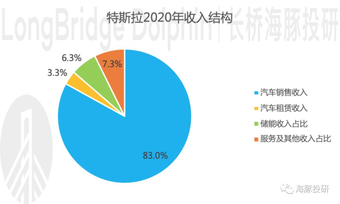 而和传统车企不同的地方则体现在目前营收占比还比较低的储能和服务业务,2020年服务业务及其他营收占比7.3%、储能业务营收占比6.3%。