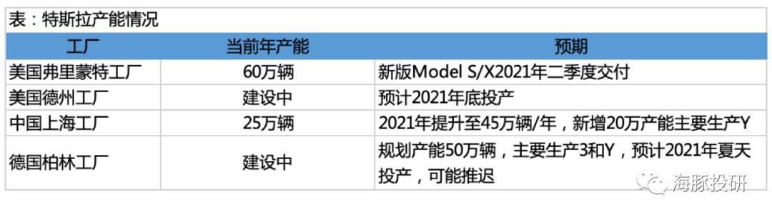 特斯拉目前工厂产能情况如下,按照特斯拉2021年全年销售超80万辆的目标来看,产能是有保障的。