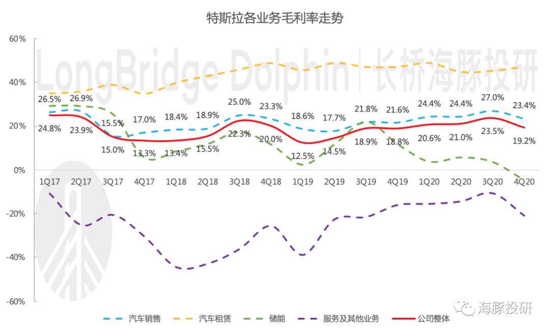 市场在长期预期中特斯拉单品爆款逻辑会带来汽车交付量和毛利率的双线上行,但2020年四季度特斯拉毛利率边际下滑,对股价造成一定压力,本次季报我们依然要继续去关注汽车业务毛利率是否会继续下滑?