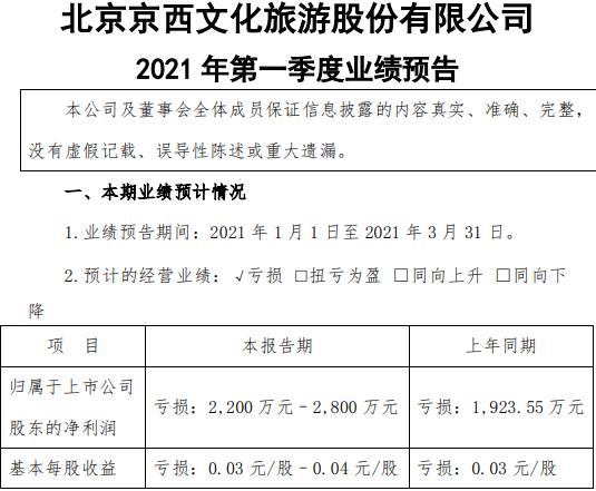 北京文化发布的2021年第一季度业绩预告,预计报告期内归属于上市公司股东的净利润为亏损2200万元—2800万元,下降幅度为-45.56%至-14.37%。