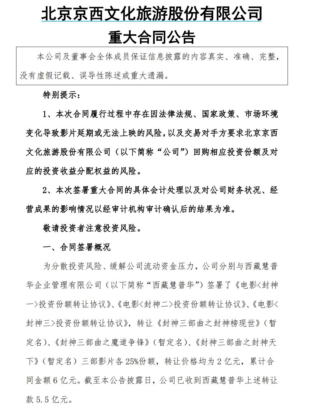 4月21日晚,北京文化发布公告称,为分散投资风险、缓解公司流动资金压力,公司分别与西藏慧普华企业管理有限公司签署了《电影 <封神一> 投资份额转让协议》、《电影 <封神二> 投资份额转让协议》、《电影< 封神三>投资份额转让协议》,转让《封神三部曲之封神榜现世》(暂定名)、《封神三部曲之魔道争锋》(暂定名)、《封神三部曲之封神天下》(暂定名)三部影片各25%份额,转让价格均为2亿元,累计合同金额6亿元,截至本公告披露日,公司已收到西藏慧普华上述转让款5.5亿元。