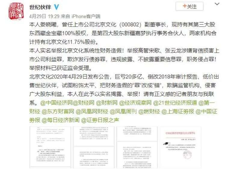 去年4月29日,娄晓曦实名举报北京文化及其高管