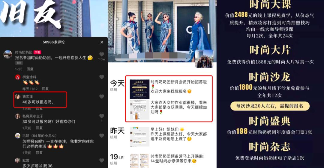 “时尚奶奶团”走的则是另外一条变现之路。奶奶们先是走花路出道,先后参加浙江卫视的跨年晚会和CCTV-3的节目录制,从视频留言区和微信朋友圈的展示看,也已经做起了培训和招募会员的业务。