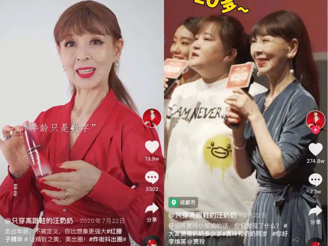 一般来说,这些大V会以广告、上通告、直播带货、培训等形式变现。比如抖音粉丝数高达1630多万的“只穿高跟鞋的汪奶奶”就十分典型,她曾在视频中推荐大牌美妆,还与贾玲等明星“合体”,为后者新电影宣传造势。