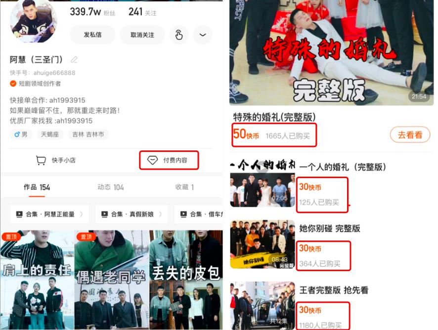 另一位快手主播“阿慧(三圣门)”靠的是内容付费,学的是长视频会员点播的逻辑。其价格为50快币(6元人民币相当于42快币)的短剧“特殊的婚礼”,已经有1665人购买,该剧的付费收入折合人民币近一万元。
