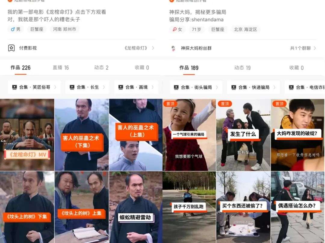 实际上,抖音、快手上拍摄中老年短剧的大V,大多都背靠MCN机构。比如“只穿高跟鞋的汪奶奶”所属MCN八爪鱼文化、“时尚奶奶团”所属北京令闻天下文化传媒有限公司、“末那大叔”来自超级视。相比个人博主,这些大V的粉丝更多、资源更多,变现方式也更多样。