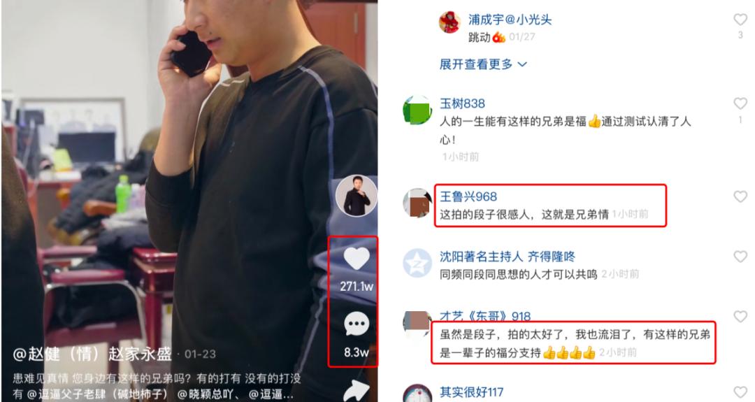 “段子很感人,这就是兄弟情。”“我都流泪了,有这样的兄弟是一辈子的福分,支持。”该条4分钟的视频获得了270多万点赞和8万多评论。靠着“兄弟情深”的合集,该博主收获近200万粉丝。