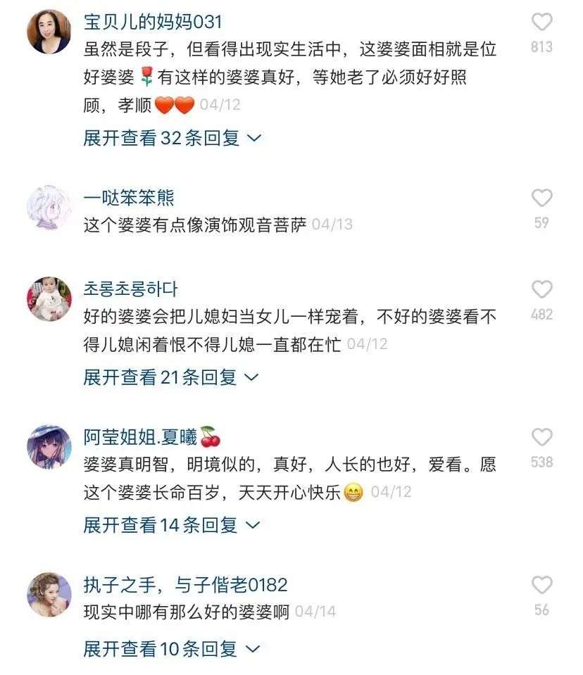 另一方面,这些短剧深谙中老年用户内心的“爽点”。以“婆婆也是妈”为例,剧中的婆婆永远站在儿媳妇的角度考虑问题,评论区随处可见“现实中哪有这么好的婆婆啊?”这样的留言。这位博主镜头里的婆婆,已经成了粉丝们心中认定的好婆婆,人设讨喜,加之剧情能让已婚女性和婆婆产生共鸣,从而引发更大范围的网友的关注和讨论。