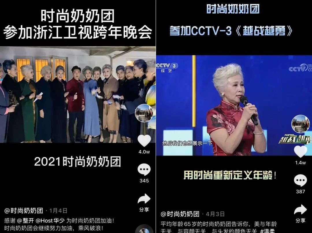 比如“时尚奶奶团”在1月份参加了浙江卫视的跨年晚会,4月份还参加了CCTV-3的节目录制,这些奶奶们不仅能做网红,还能走花路出道。