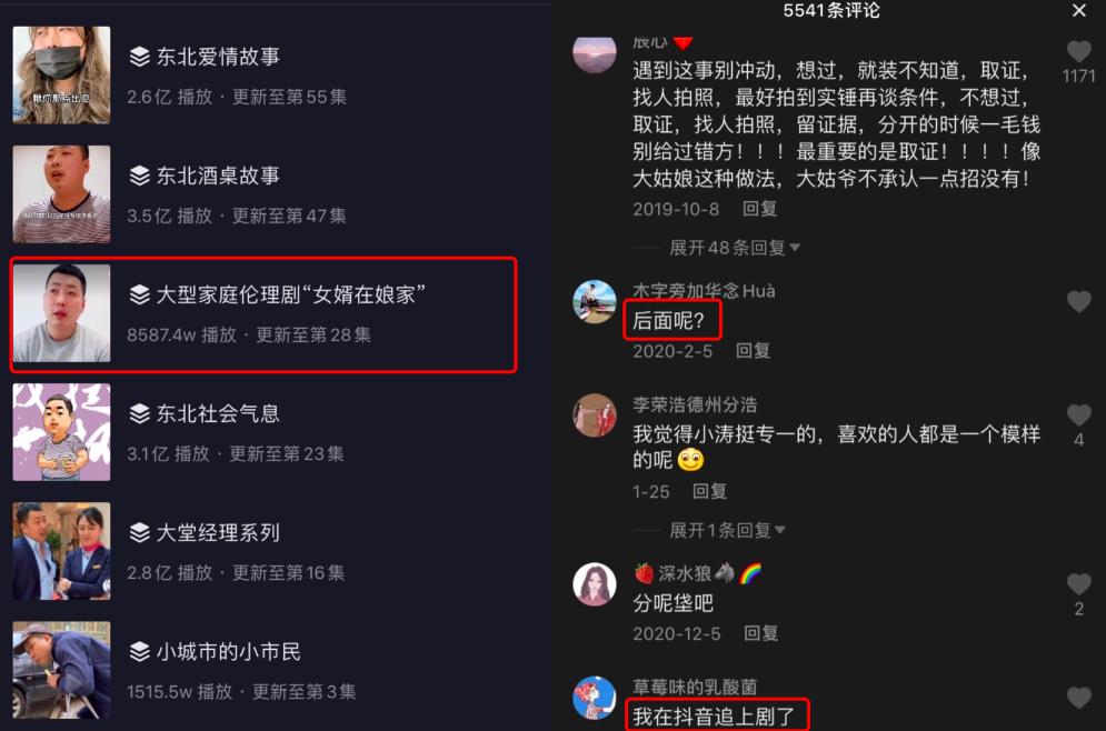 佼佼者们深谙其道。快手博主“婆婆也是妈”每发一条视频,都会带上“家庭”“婆媳”的话题,视频内容也是以如何处理婆媳关系为核心。抖音470多万粉丝的博主“老四的快乐生活”,则通过短剧把女婿和丈母娘之间的“爱恨情仇”演绎得淋漓尽致,其“女婿在娘家”系列短剧累计播放量超8500万次,每条视频下方都有网友在热烈讨论剧情,并时不时催更。