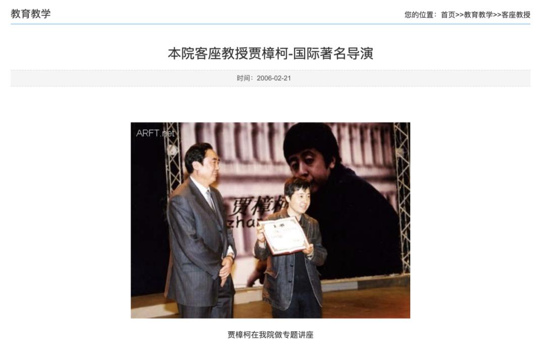 其实,在贾樟柯担任山西电影学院院长之前,据山西传媒学院的官网资料显示,他就已经是山传的客座教授了。