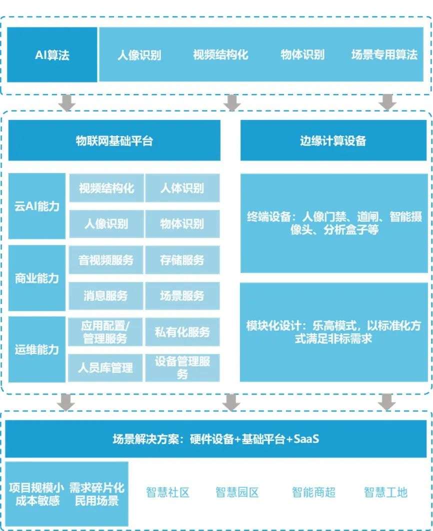 三是物联网能力。光有设备能力和AI能力,无法真正结合场景。我们曾经拿着设备找到物业公司,对方说,“你走吧,我需要的是一套完整的解决方案”。什么是解决方案?包含硬件设备、后台软件,最好能和他们现有的系统打通。在未来万物互联的时代,来源于物联网设备的数据会占据相当比例,物联网的能力很关键。它包含平台和应用的能力,一方面实现设备的整体连接,另一方面为客户提供拓展应用。