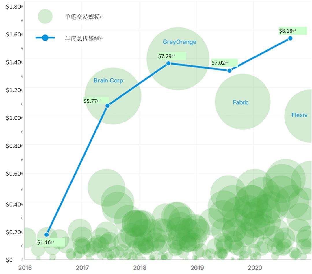 美国风投基金在机器人行业的投资(亿美元)