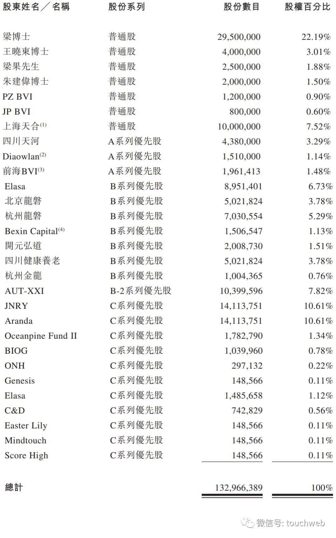 IPO前,梁朋博士持股为22.19%,王晓东博士持股为3.01%,梁果持股为1.88%,朱建伟博士持股为1.5%;