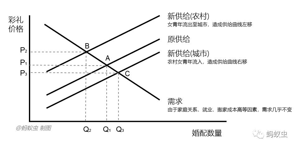 同理,农村女青年的流入让城市的供给量增加,于是供给曲线右移,均衡点从A点变为C点,彩礼价格从P1降为P3,而婚配数量则为Q1增长至Q3,城里小伙找对象更容易了。而此时,农村的彩礼价格已上升到P2,就高出城市P3一大截。