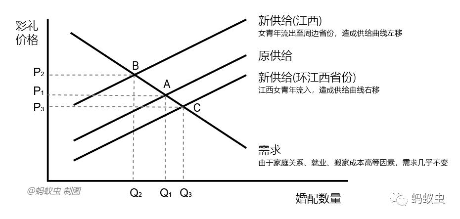在无差异曲线理论中,由于经济较周边省份落后,江西居民福利水平整体不如它们,因此横坐标的位子处于周边省份的左侧。如果想让自己站在无差异曲线上被适龄女性选中,江西适龄男性就必须拿出更高的彩礼。而在供需曲线理论下,江西省的适龄女青年外流周边省份,导致己方的供给下降而周边省份的供给增加了,最终彩礼价格上升而婚配数量下降。