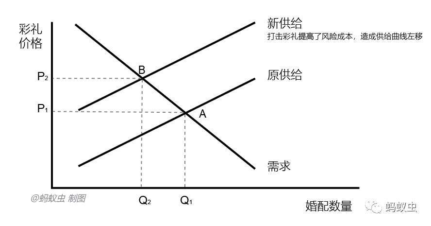 且不讨论严厉打击高价彩礼的合法性,不妨先从理论上推导一下打击对市场的影响。假设某地制定彩礼上限价格,超过标准一经发现将对女方罚款10万元。由于政策本身没有改变供需关系,只是提高了女方的风险成本,相当于实际彩礼金额为收到彩礼减去10万元,那么供给曲线将向左移动,均衡点从A移动到B,出现了彩礼价格上升、婚配数量减少的情况。