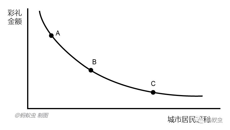 一般而言,城市的经济越发达,它提供的就业、医疗、教育、文化、体育等生活服务就越丰富和优质,居民从中获得的福利价值越大,足以抵消一部分彩礼金额。当C点无限向右下移动时,彩礼金额便趋近于零。网友留言中也人说,身边有一些江西女性外嫁到他们那,反而没有要彩礼;北京、上海等城市里的男青年,有时无需个人能力和家庭条件,凭借着户口身份就可以赢得外地女青年的青睐,其实也是这个道理。