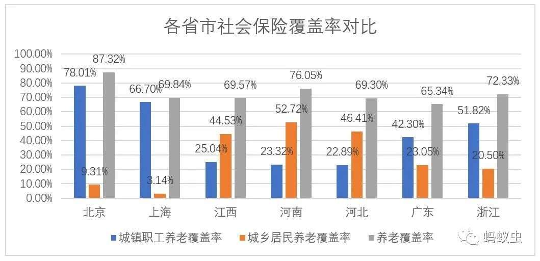 注:原始数据来源于国家统计局或各省市统计局,蚂蚁虫整理统计。其中:浙江省为2019年数据,河南省的居民社保人数为2018年的最新数据。