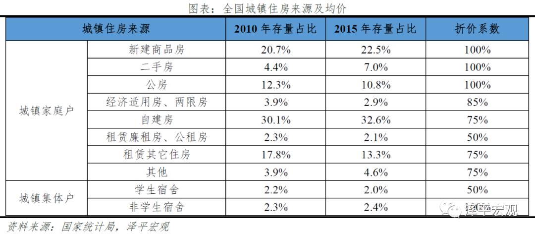 1)人口普查和“小普查”等资料将城镇家庭户住房按来源分为新建商品住房、二手房、公房、经济适用房及两限房、自建房、租赁廉租房及公租房、租赁其它住房、其他等八类。商品住房、二手房、公房可正常交易,按标准价;廉租房、公租房面向住房困难群体,不可交易,假定按50%折价;经济适用房和两限房新房售价比周边同类商品住房低20%-25%,经济适用房5年后可上市交易,届时要按照与同地段普通商品住房差价的一定比例向政府交纳土地收益等相关价款,此类型住房假定按85%折价;其余类别假定一半按标准价交易,一半按50%折价,即75%折价。全国来看,2015年八类住房比例较2010年变化不大,我们使用2015年地级住房来源占比代表2018年,缺失的地区使用2010年数据代替。各地八类城镇家庭户住房存量乘以相应的单价得到地级城镇家庭户住房市值,地级相加得到全国城镇家庭户住房市值。2)城镇集体户学生宿舍不可交易,按50%折价,城镇集体户非学生宿舍按标准价。各地两类城镇集体户住房存量乘以相应的单价得到地级城镇集体户住房市值,地级相加得到全国城镇集体户住房市值。全国城镇家庭户住房市值与城镇集体户住房市值相加得到全国城镇住房市值。3)全国城镇住房市值除以城镇存量得到当年全国城镇房价。结合OECD历年名义房价指数变化得出历年城镇房价,乘以历年城镇存量得出历年城镇住房市值。