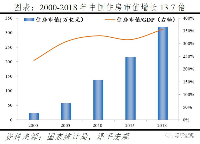 2000-2018年中国住房市值从23万亿元增加到321万亿元,年均增长15.7%;其中,住房存量增加、房价上涨分别贡献11%、89%;人均住房市值从1.8万元增加到23万元,年均增长15.2%,高于人均GDP的13.8%;城镇人均住房市值从4.5万元增加到36.8万元,年均增长11.1%。因住房市值年均增速超过名义GDP的13%,住房市值与GDP的比例从234%增长到356%。2000年中国住房市值只有23.4万亿元,人均住房市值1.8万元,住房市值与GDP比例为233.7%;其中,城镇、乡村住房市值分别为20.4、3万亿元,占比分别为87.2%、12.8% ,城镇人均住房市值 4.5 万元 。2010年中国住房市值为136.7万亿元,人均住房市值10.2万元,住房市值与GDP比例为331.1%。其中,城镇、乡村住房市值分别为128.5、8.2万亿元,占比分别为94%、6% ,城镇人均住房市值 19.3 万元 。到2018年,住房市值达到320.8万亿元,人均住房市值达到23万元,住房市值与GDP比例为356.3%。其中,城镇、乡村住房市值分别为299.2、21.6万亿元,占比分别为93.3%、6.7% ,城镇人均住房市值 3 6.8 万元 。
