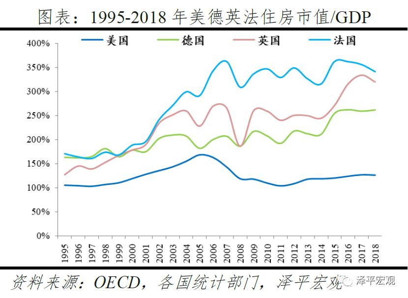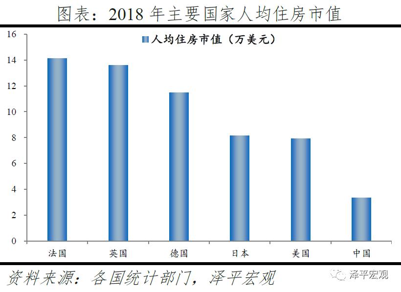 从住房市值占股债房市值的比例看,2018年中国为71%,高于美国的28%、日本的37%、英国的51%、法国的58%、德国的66%。但从人均住房市值来看,2018年中国为3.3万美元,远低于美国的7.9万美元、日本的8.1万美元、英国的13.6万美元、法国的14.1万美元、德国的11.5万美元。