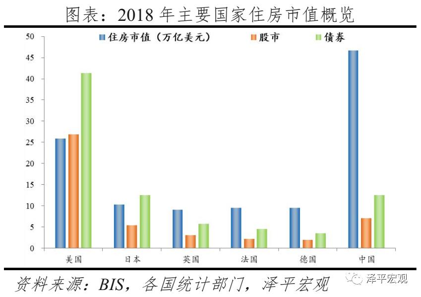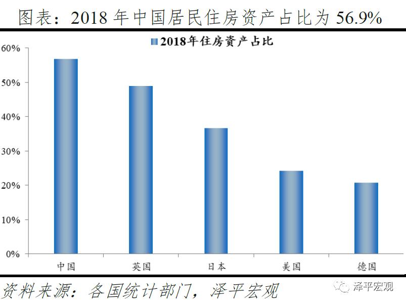 中国住房市值在国际处于什么水平?1)与发达国家相比,中国住房市值及与GDP、股债房市值的比例均较高,但人均住房市值低。从住房市值看,2018年中国为46.7万亿美元,明显大于美国的25.8万亿美元、日本的10.3万亿美元、英法德三国合计的28.0万亿美元。 从住房市值与GDP的比例看,2018年中国为356%,高于美国的126%、日本的208%、德国的238%、英国的320%、法国的341%。中国住房市值及其与GDP比例较高源于人地错配、供求失衡以及货币超发,一二线高房价,三四线高库存,导致全国住房市值高。按照“人往高处走、人随产业走”的经济规律和国际经验,中国人口长期大量向都市圈集聚,但在“控制大城市规模、重点发展小城镇、区域均衡发展”的计划经济思维误导下,人地严重错配,一二线城市人口流入但土地供给严重不足导致高房价,三四线城市人口流出但土地供给过多导致高库存 ,进而导致全国住房市值较高。 从住房市值占股债房市值的比例看, 2018 年中国为 71% ,高于美国的 28% 、日本的 37% 、英国的 51% 、法国的 58% 、德国的 66% 。但从人均住房市值来看, 2018 年中国为 3.3 万美元,远低于美国、日本、英国、法国、德国的 7.9 、 8.1 、 13.6 、 14.1 、 11.5 万美元。 中国住房市值与股债房市值的比例较高还在于中国资本市场发育不成熟,直接融资比例较低,导致股票、债券市值较低。2)与发达国家相比,中国居民家庭配置房产比例较高。2018年中国居民家庭住房资产在家庭总资产中占比达到57%,高于英国的49%、日本的37%、美国的24%、德国的22%。 在中国较高房产比例的另一面,则是较低比例的金融资产配置。 2018 年中国居民金融资产配置占比为 40.4% ,远低于美国的 70.6% 、日本的 63.9% 、英国的 53.4% ,略高于法国的 39.2% 。