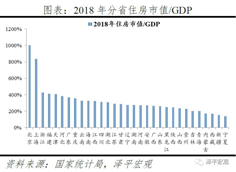 中国住房市值有多大?1)2018年中国住房市值321万亿元,是GDP的3.6倍,占股债房市值的71%。2000-2018年,中国住房市值从23万亿元增至321万亿元,年均增长15.7%;其中,住房存量增加、房价上涨分别贡献11%、89%。人均住房市值从1.8万元增至23万元,年均增长15.2%,高于人均GDP年均增长的13.8%;城镇人均住房市值从 4.5 万元增加到 36.8 万元,年均增长 11.1% 。住房成为居民家庭最重要的财富,并与金融机构高度关联。住房市值年均增速超过名义GDP的13%,因此住房市值与GDP的比例从233%增至356%。住房市值占股债房市值的比例由75%波动下降至71%;2000年比例较高的主要原因在于当时资本市场初步发展,股市债市规模合计7.7万亿元,仅相当于GDP的77%。2)东部地区住房市值占全国超6成,粤京沪苏浙鲁6省住房市值占5成。分地区看,2018年东部、中部、西部、东北地区住房市值占比分别为63.2%、17%、15.4%、4.4%,而对应的住房存量占比分别为37.9%、29.4%、26.4%、6.3%,东部地区住房市值占比明显超过住房存量主要在于房价较高。分省看,全国51%的住房市值集中在广东、北京、上海、江苏、浙江、山东6个东部发达省份;除宁夏外,其余省份的住房市值与GDP的比例均大于150%,北京、上海、浙江、福建、天津等8省超过330%。3)一线住房市值占全国四分之一,66城住房市值与GDP比例大于350%。分线看,一线、二线、三四线住房市值占全国比重分别为25%、31%、44%,而其住房存量占比分别为4.1%、19.8%、76.1%,住房市值与GDP的比例分别为693%、345%、259%。一二线住房市值高主要源于人口长期集聚下的人地严重错配和货币长期超发。具体来看,住房市值与GDP的比例小于150%、在150%-250%之间、在250%-350%之间、大于350%的地级单位分别有47、120、103、66个。其中,住房市值与GDP的比例小于150%的城市多在西部地区,经济相对落后,人口总量小且长期外流。住房市值与GDP的比例大于350%的城市主要分为两类:一是北京、上海、深圳、杭州、南京、厦门等核心城市;二是三亚、大理、恩施等旅游城市。可以发现,城市层面住房市值与GDP的比例高低与该城市房地产风险大小并无明显联系。