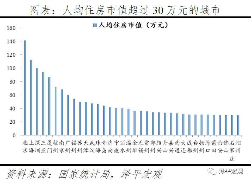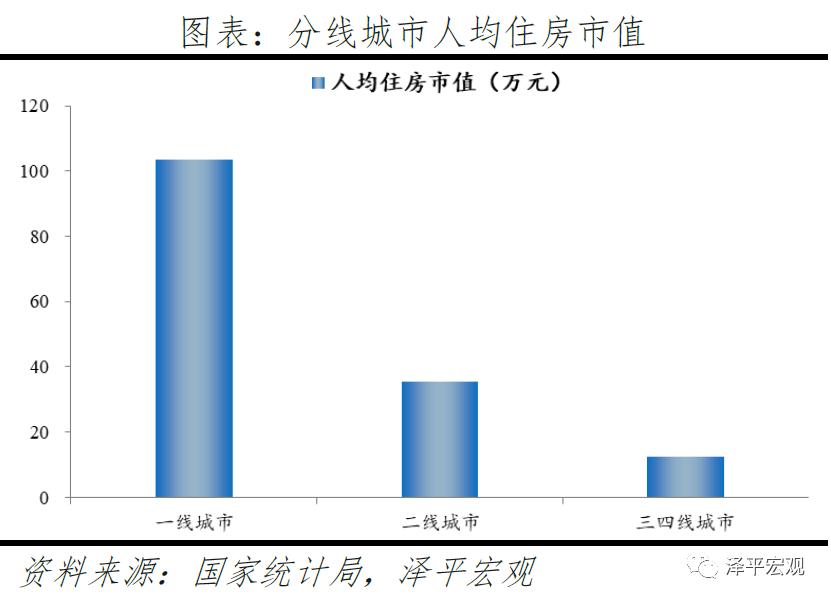 一二线住房市值高主要源于人口长期集聚下的人地严重错配和货币长期超发,房价明显较高。第一,人口长期大量向一二线核心城市集聚。1990-2018年,一线城市人口占比从2.8%增至5.3%,二线城市人口占比从16.1%增至20.5%,三四线城市人口占比从81%降至74.2%。人口向一二线集聚的背后,是经济的集聚。该时期,一线城市GDP占比从9.4%增至12.2%,二线城市GDP占比从23.8%增至33.7%,三四线城市GDP占比从66.8%降至54.1%。2018年,一线、二线、三线、四线城市经济-人口比值分别为2.3、1.6、1.0、0.6,这预示着四线城市人口将继续大幅流出,一二线城市人口将继续集聚。此外,核心城市优质公共资源高度富集,中国特有户籍制度使得公共资源与户口挂钩,而户口基本与房产挂钩的情况更加促进全国高收入人群向核心城市集聚。第二,人地严重错配,一二线城市土地供给严重不足。根据住建部统计,2006-2016年中国城区人口1000万人以上的城市城区人口增量占比16.9%,而建设用地增量占比仅3.5%。此外,大城市住宅用地被严格控制,2009-2018年一线城市住宅类用地供应面积从2585万平方米降至1426万平方米,占100个大中城市住宅类用地比例从8.0%波动降至4.5%;二线城市住宅类用地比例从45.3%波动下降至43.2%;而三线城市从39.8%波动上升至51.3%。第三,货币超发使得广义货币增速多高于名义GDP增长,尤其刺激供给短缺、优质公共资源富集的一二线城市房地产价格快速上涨。 1998 年以来中国广义货币供应量 M2 年均增速 15.2% ,高于名义 GDP 年均增速的 12.5% , 全国新建商品住房销售均价年均增速达 7.9% ,低于同期 M2 增速 7 个百分点,而一线城市房价基本与 M2 增速持平。