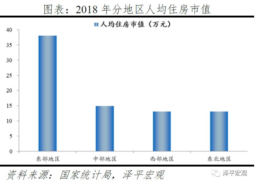分地区看,2018年东部地区、中部地区、西部地区、东北地区住房市值占全国的比重分别为63.2%、17%、15.4%、4.4%,而各地区对应的住房存量占全国的比重分别为37.9%、29.4%、26.4%、6.3%,东部地区住房市值占比明显超过住房存量主要在于房价较高。2018年东部、中部、西部、东北地区住房市值分别为202.6、54.6、49.4、14.1万亿元,分别占全国的63.2%、17%、15.4%、4.4%;人均住房市值分别为38.1、14.9、13.1、13.1万元;住房市值与GDP的比例分别为421.2%、283.6%、249.3%、268%。而对应的住房存量分别为188.5、146.4、131.1、31.2亿平,占全国的37.9%、29.4%、26.4%、6.3%。