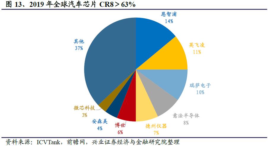 值得关注的是,全球汽车芯片市场颇为集中,几乎被发达国家公司垄断,其中恩智浦占全球汽车芯片市场的比重最大,约14%;英飞凌其次,达11%。由于汽车芯片对安全、可靠性要求高,有数据显示中国进口汽车芯片占比达90%以上。