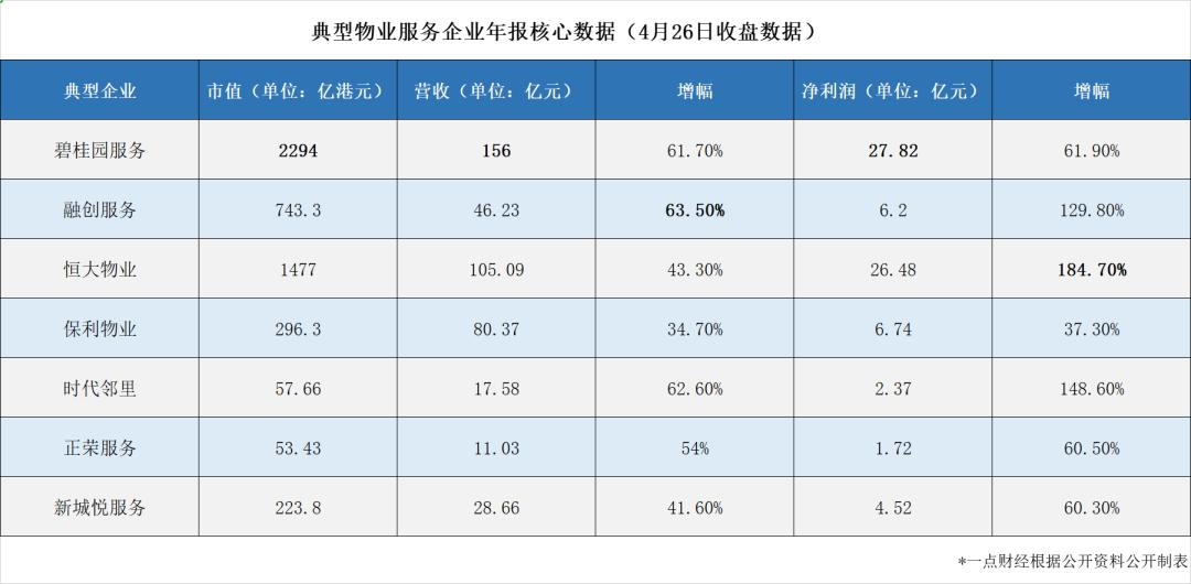 眼下,大如碧桂园服务(06098.HK)、融创服务(01516.HK)、恒大物业(06666.HK),小如时代邻里(09928.HK)、荣万家(02146.HK)、正荣服务(06958.HK),渐次发布年报。其中多数都是首次公布业绩,超高的增速在地产板块已是多年未见。