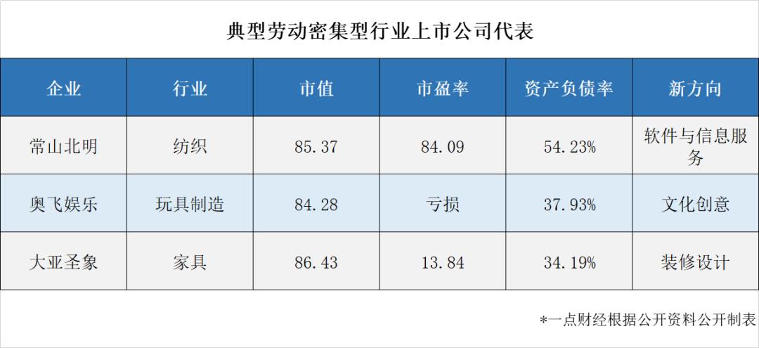 提起执行“人海战略”,A股上市公司不少:纺织业的常山北明(000158.SZ)、玩具制造业的奥飞娱乐(002292.SZ)、家具业的大亚圣象(000910.SZ)。它们身处不同领域,却有相同的归属,“劳动密集型行业”。