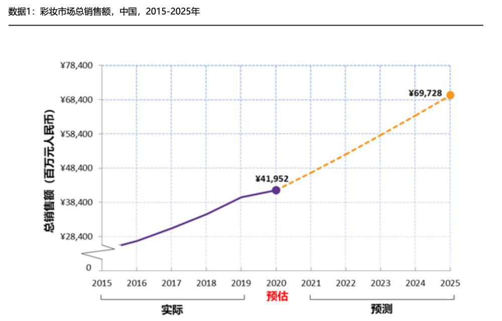 英敏特集团发布的中国彩妆报告显示:2019年中国彩妆市场增长率达14.1%;新冠疫情扰乱了2020年的彩妆市场,但他们估算2020年这一市场仍有5.1%的整体销售额增长,市场规模增至420亿元人民币。未来5年中国彩妆市场将以10.7%的年均复合增长率增长,到2025年其市场规模将达到700亿元。