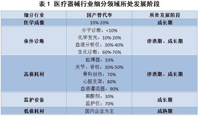 具体到医疗器械行业,我们可以把医疗器械行业进一步细分(表1),在细分的基础上评估其所处发展阶段(在此,把发展阶段分为渗透期、成长期、成熟期、衰退期/再造期),进而大致框定处于不同发展阶段优秀企业资产来源和资产去向的共性特征(表2)。