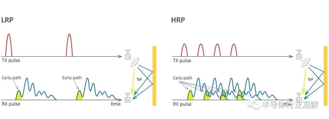 在时域,UWB信号的形式则是短脉冲,根据脉冲的发射频率可以分为低频率脉冲(LRP)和高频率脉冲(HRP)两种,分别对应对数据传输率有不同需求的场景。UWB的脉冲信号形式和脉冲雷达很像,这也是UWB可以用来做定位的原因——其原理和雷达一脉相承。UWB定位的一大优势是其精确度高。与蓝牙或WiFi等基于射频信号强度来做定位的方法相比,UWB计算距离使用的原理是飞行时间(ToF),即发送端发射一个信号,接收端在收到这个信号之后经过协议定义的延迟后再发回给发送端,这样发送端只要比较发送和接受信号的时间差并乘以光速就能获得发送端与接收端之间的距离,从而可以实现亚米级别的距离精度。