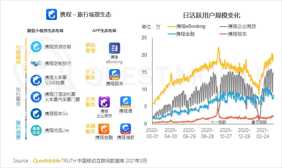 不过,看似稳态的流量结构,并不意味着他们高枕无忧。一方面,新生代的崛起,正在持续蚕食流量基本盘,截止2021年3月,字节系、快手系、美团系月活用户分别达到8.34亿、5.41亿、4.05亿;另一方面,各行业的头部玩家,也总算开始找到点感觉了,比如携程,通过六个APP+六个小程序,贯穿行前规划、出行服务、旅行消费整个旅行场景;第三方面,线下玩家,也在数字化上快速推进,例如屈臣氏、CoCo都可等,其主要小程序月活用户已经分别达到645万,218万。