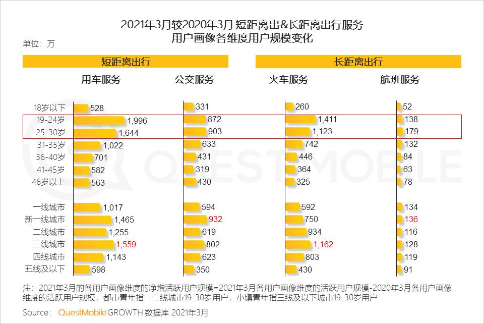 7.4 都市青年和小镇青年是出行服务各细分领域用户增长的主要动力, 都市青年偏向公交和航班服务,小镇青年则倾向汽车和火车服务