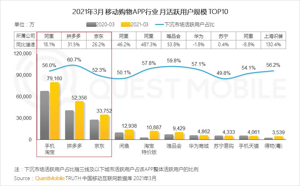 Ⅰ. 电商流量争夺加剧,头部与尾部的差距随着用户规模的增长继续扩大,下沉市场的流量价值持续发挥作用