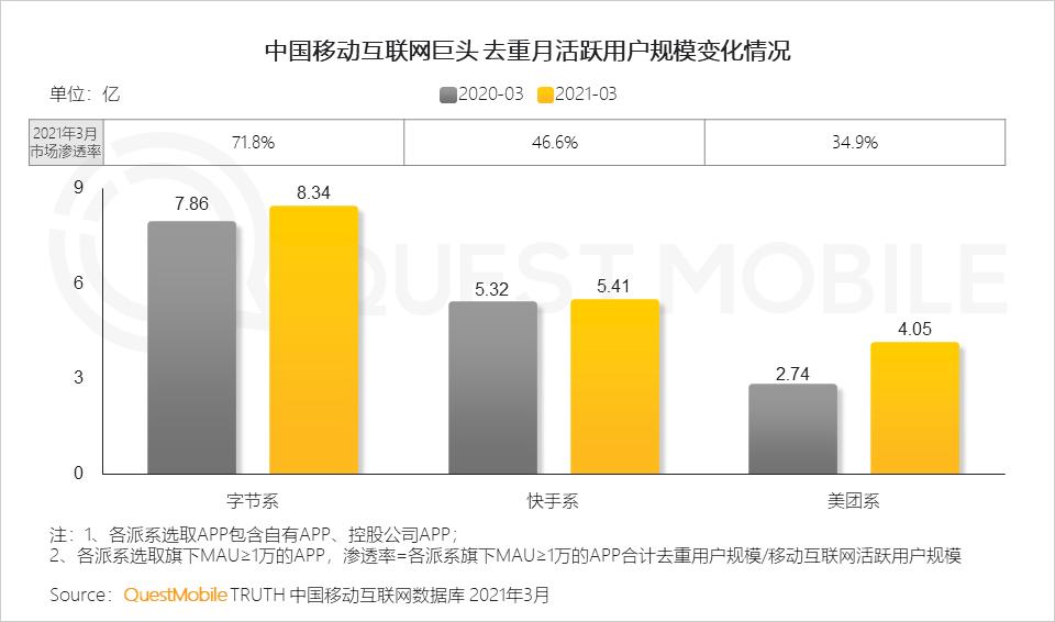 2.1 字节、快手、美团基于其核心APP用户的快速增长和市场对其应用功能的高度需求,整体覆盖率近几年持续扩大,来争夺用户使用场景、流量和时长