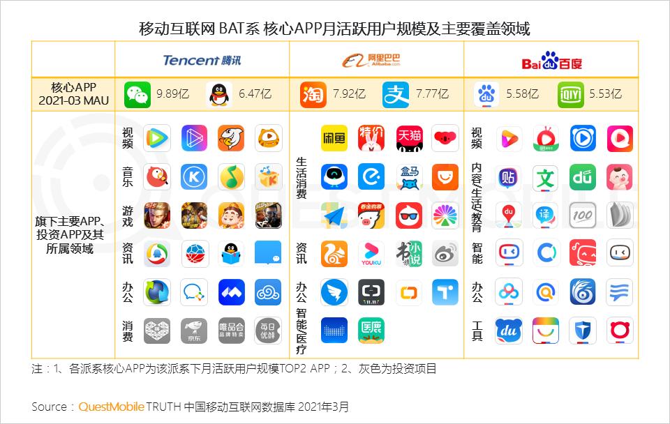 在移动互联网的稳态结构中,BAT继续坐拥庞大的流量矩阵:腾讯覆盖视频、音乐、游戏、资讯、办公等领域,其核心APP微信9.89亿用户、QQ6.47亿用户;阿里覆盖生活消费、资讯、办公等领域,其核心APP淘宝7.92亿用户、支付宝7.77亿用户;百度覆盖视频、内容、教育、智能、办公、工具等领域,其核心APP百度5.58亿用户、爱奇艺5.53亿用户。同时,各自小程序也给他们带来了新的流量体系。