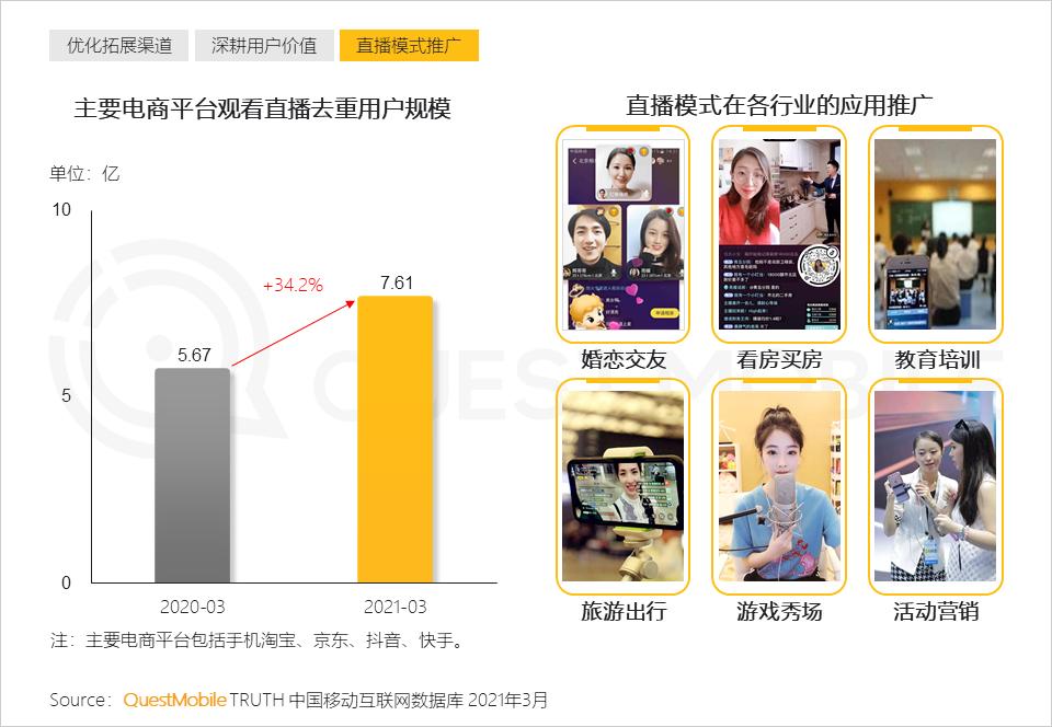 7、直播已成为电商销售的重要方式,用户规模实现快速增长,在不同行业也得到了进一步应用和推广