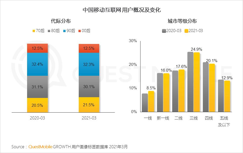 为什么这么说呢?先来看看数据。QuestMobile数据显示,虽然2021年Q1经济和消费均大幅提升,不过,移动互联网用户变化不大,截止到2021年3月,用户数量11.62亿,仅比2020年规模低谷期9月份增加了822万;同时,用户结构也趋向稳定:70后、80后、90后、00后占比分别为21.5%、30.1%、32.3%、12.5%;一线、新一线、二线、三线、四线、五线及以下城市用户占比分别为8.5%、16.0%、17.6%、24.9%、20.1%、12.9%。