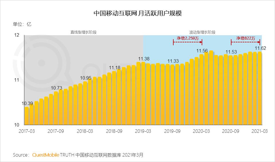 根据QuestMobile数据显示,中国移动互联网用户在2020年5月达到11.64亿高位后,出现一定程度回落,但与2019年相似的是,移动网民规模在9月份回落到低点之后再度呈现增长态势,月活用户数出现阶段性波动变化,一季度是重要的涨幅期,只是增长规模较上一阶段同期有所缩小。