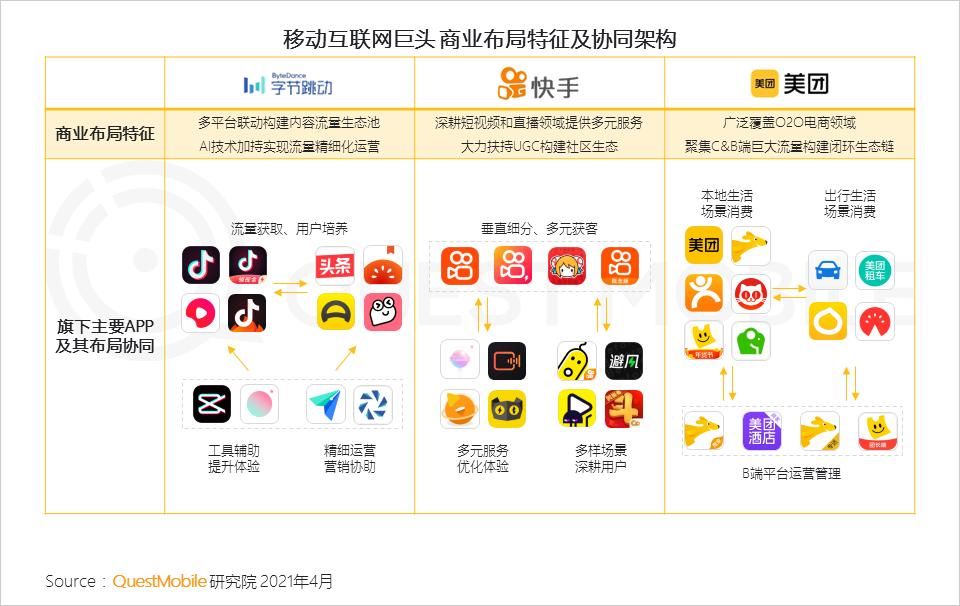 2.2 字节、快手、美团基于核心领域加速市场拓展,通过不同版块的有机协同,拓新互联网现有格局,构建多元化商业模式