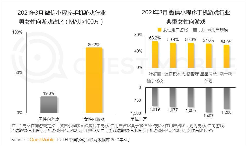 4.3 微信小程序手机游戏以女性向为主,轻便易操作的益智休闲、消除类型等游戏深受女性用户的偏爱