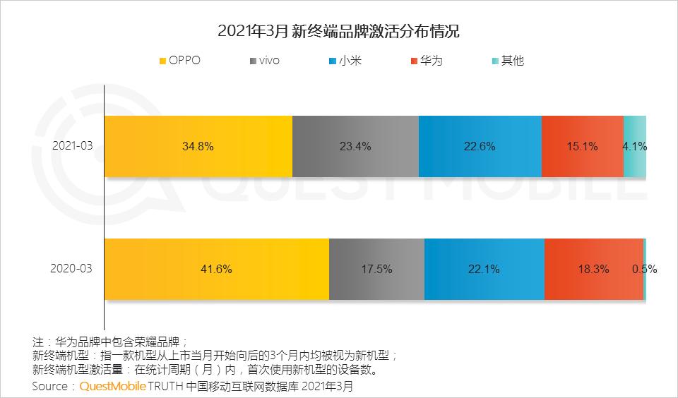 1.2 各大品牌争战5G市场,四大国内手机厂商新终端激活分布趋向均衡,市场竞争愈发激烈