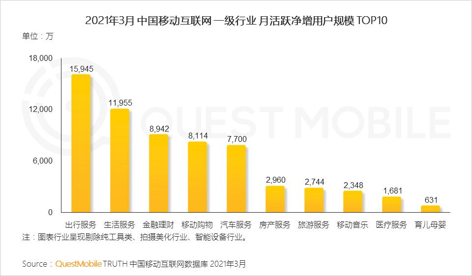 根据QuestMobile数据显示,2021年3月月活跃净增用户规模TOP10的一级行业中,各类服务性行业占据主要席位,其中出行服务行业增长规模最大,净增用户1.59亿;另外金融理财和移动购物也呈现大规模增长,与人们各方面消费需求的提升密切相关。