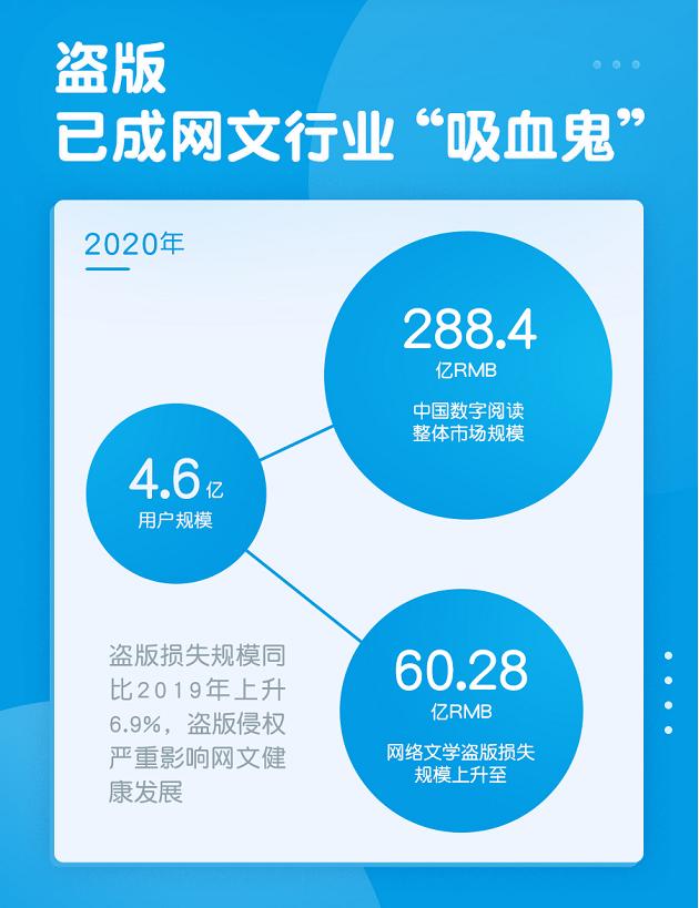 盗版横行直接给网文行业造成了巨大的损失。4月26日,易观分析发布的《中国网络文学版权保护白皮书》(下文简称“《白皮书》”)显示,2020年中国网络文学盗版损失规模达60.28亿元,同比2019年上升6.9%,新技术滥用、传播途径杂多和盗版在全产业链实现覆盖是规模上升的主要因素。