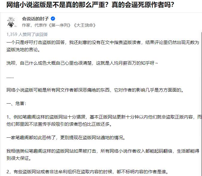 知乎上有个热门问题:“网络小说盗版是不是真的那么严重?”引来了知名网文作者“会说话的肘子”的关注,他回复道“毫无下限”。